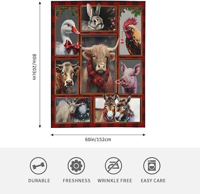 Christmas Blanket Highland Cow Farm Animal Throw Blanket Ultra Soft Cozy Fleece Goat Chicken Goose Duck Pig Donkey Gift Fuzzy Plush Bedding Blankets for Kids Adult Girls Boys Women Men 80"x60"