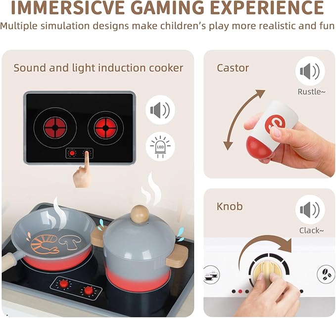 - Wooden Large Play Kitchen: Kids kitchen playset includes sink, oven, stove, coffee maker, ice maker and microwave, and cooking utensils as pot, pan. Rotatable buttons, click sounds and lights simulate real cooking, can meet the children's play needs