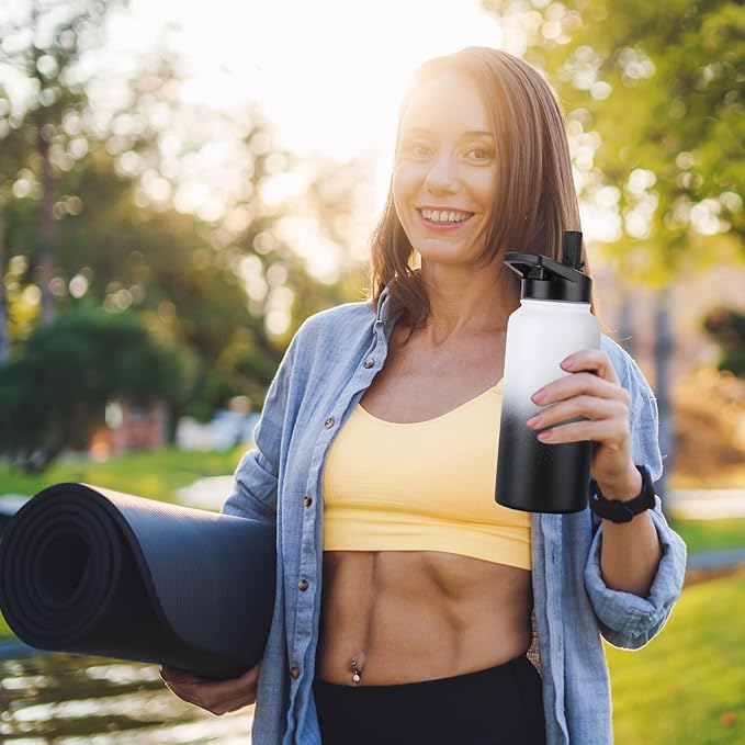 DOMICARE 32 oz Insulated Water Bottle, Vacuum Insulated Stainless Steel Sports Water Bottle with Straw Lid & Spout Lid, Leakproof, Reusable - Travel, Camping, Bike, Black White Gradient