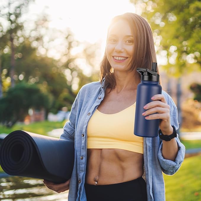 DOMICARE 32 oz Insulated Water Bottle, Vacuum Insulated Stainless Steel Sports Water Bottle with Straw Lid & Spout Lid, Leakproof, Reusable - Travel, Camping, Bike, Navy Blue