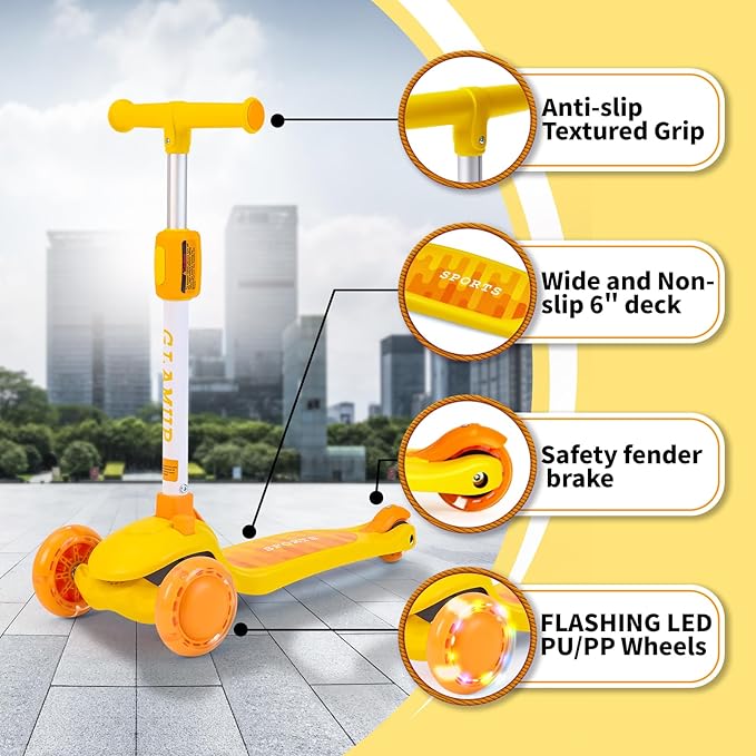 GLAMUP Kids Kick Scooter 3 Wheels, Kids Scooter Height Adjustable Handlebar, Lean-to-Steer System & Easy-Folding Mechanism, Ages 3-14 Boys and Girls