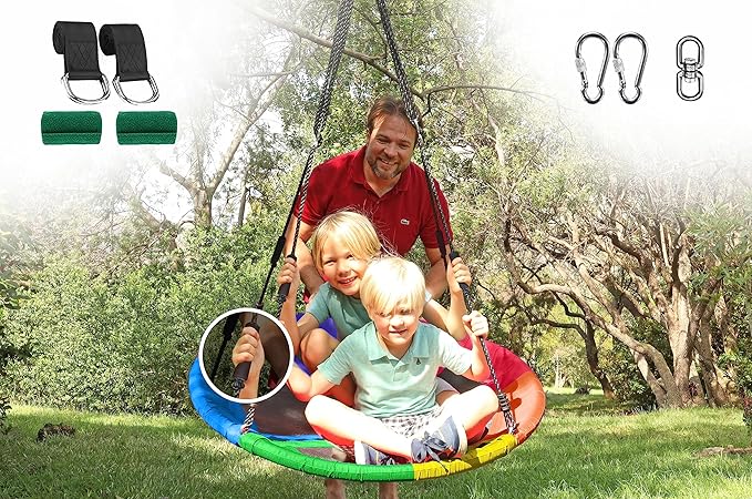 - 【WHAT YOU GET】Our spinning saucer swing includes 2 free 5ft thickened Swing Straps, 2 stainless steel Carabiners, and 1 swivel hook. No need to buy additional auxiliary accessories. 12 mm thick ropes are made from premium quality PE webbing with metal rings