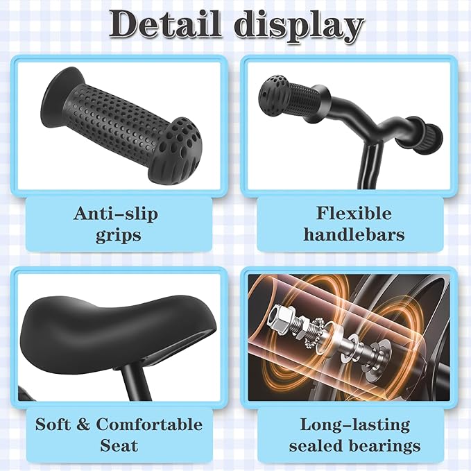- 【Adjustable Handlebar and Seat】The balance training bike features an adjustable handlebars and comfy seat.It can be adjusted easily while the child grows up.the seat can be adjustable from 30-41cm(11.8"-16.14")