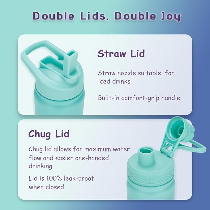 - 2 LEAK-PROOF LIDS: Stainless steel water bottle kids come with a BPA-free Straw Lid and Chug Lid, Offers a tight seal to prevent spills and leaks; So your kids won’t have to worry about pulling out soggy art projects or last-minute homework,2 lids can be switched at any time, Matching of different colors to suit different occasions