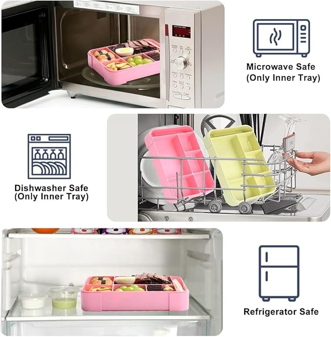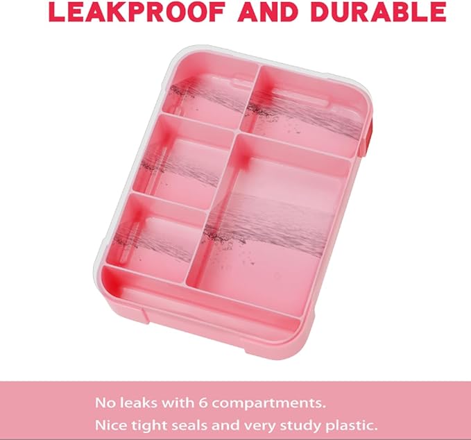 - Pink Dinosaur Lunch bag Pack Set: includes a leak proof 6-compartment pink lunch box, a spoon, a fork, and a sealed seasoning box.