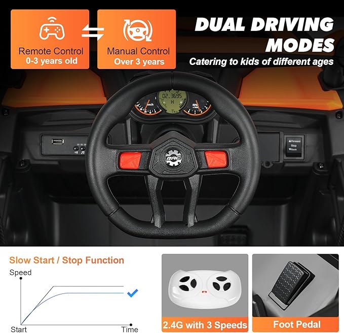 - Versatile Driving Modes: Parents can have peace of mind with two driving modes: remote control and manual control. Allow your child to take the wheel and learn the basics of driving, or switch to remote control mode when you want to maintain control for added safety.