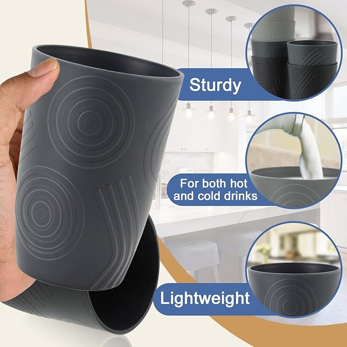 Wheat Straw Cups 6 PCS - 16 OZ Drinking Glasses, Unbreakable Drinking Cup, Water Tumbler for Kitchen, Alternative to Plastic Cups Reusable Microwave and Dishwasher Safe (Black, Grey)