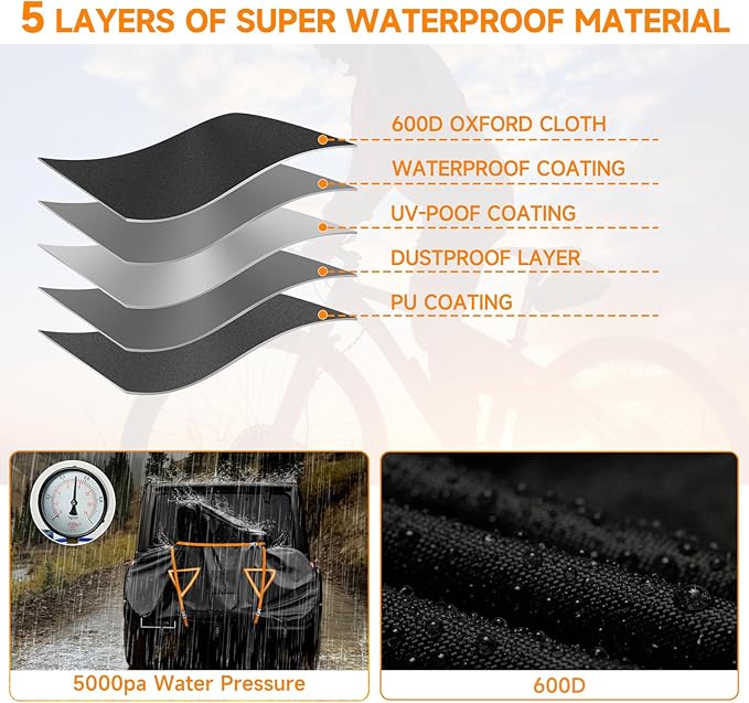- High-Performance Protection: Made of 5-layer heavy duty 600D ripstop oxford fabric, waterproof tape and double stitching technology, this bike cover provides effectively protection for your bike from sun, rain, wind, dust and other bad weather