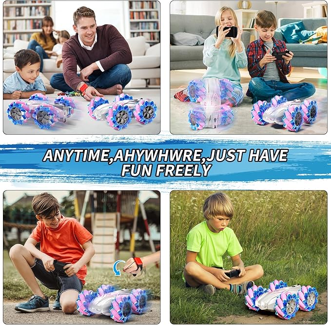 - [Multiple gameplay] AIQI gesture sensing remote control stunt car is equipped with a remote control and a sensing watch. Control the car with a watch or a remote control, and the stunt car will move forward/backward/rotate/spray/automatically demonstrate. Pairing with color changing lighting is more fun for both boys and girls, whether it's day or night, indoors or outdoors.
