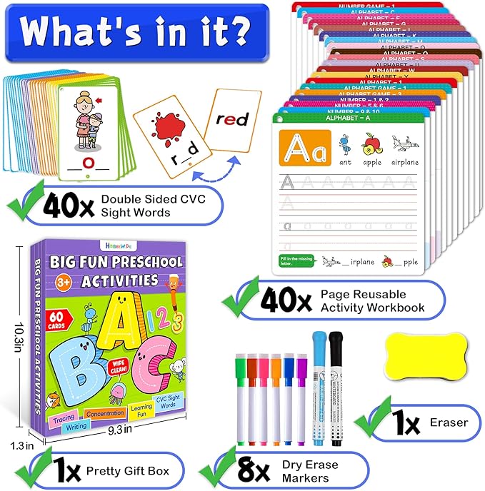 - Alphabet Learning Toys: This busy book set includes a 40-page reusable preschool workbook, 40 double-sided sight words flash cards kindergarten, 8 dry erase markers. Letters A - Z, spelling words, numbers 1 - 12, and many other learning themed activities designed for toddlers and children 3-6 to promote fine motor skills, letter and number recognition, and early word writing and spelling skills