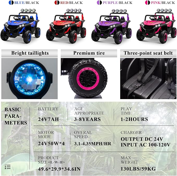 - 【Premium Material & Cool Appearance】 The 24v battery operated kids car features wear-resistant wheels,which made of superior PP materials with no possibility of leaking or tire burst, eliminating the hassle of inflating. Cool Unique design look, featuring bright front & rear lights and double door with magnetic lock, this kids ride on car brings extra surprise to your baby.