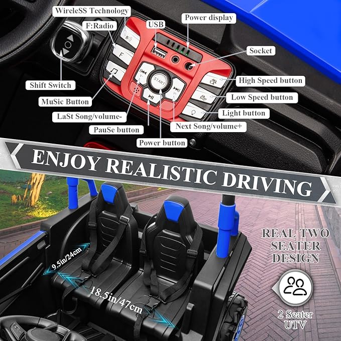 - 【Large Cool Two Seater Car】The 2 seater battery operated kids car features wear-resistant wheels,which made of superior PP materials with no possibility of leaking or tire burst, eliminating the hassle of inflating. Cool Unique design look, featuring bright front & rear lights and double door with magnetic lock, this kids ride on car brings extra surprise to your baby, provide your children with the most authentic driving experience.