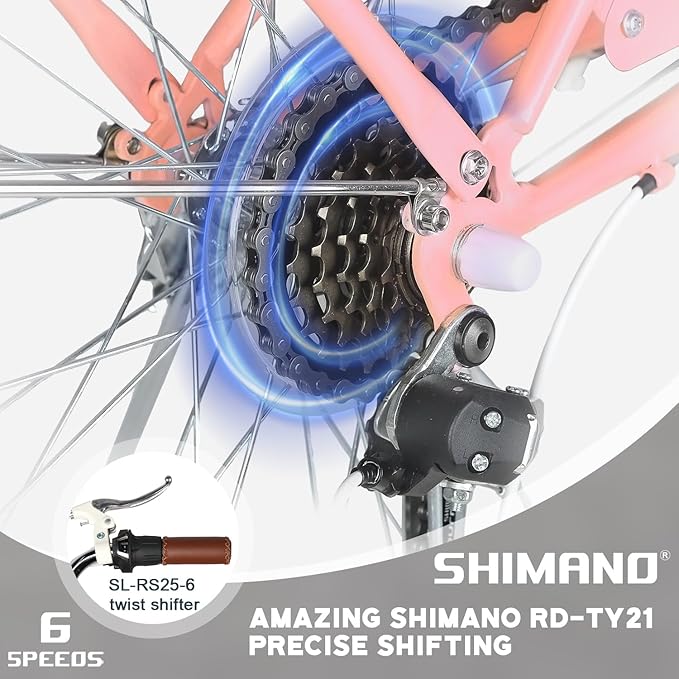 - 【High Performance】The beach cruiser bike features a Shimano 6-speed gear system and a high-carbon steel frame, helping you conquer steep hills with ease. Suitable for a variety of scenarios, from leisurely rides to long-distance commuting.