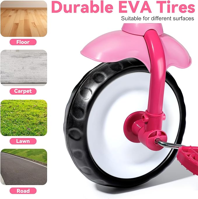 - Indoor & Outdoor Adventures: Blend indoor tranquility with outdoor exploration. This kids trike lightweight EVA tires ensure silent indoor rides that won't damage your floor. These wheels are also ready for the outdoors. Glide over grass or pavement, making each ride exciting