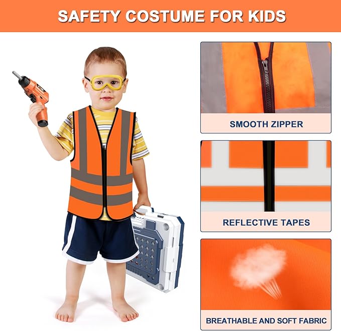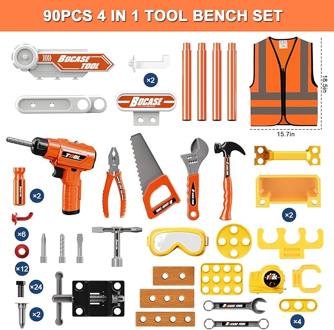 - 【Workbench with Safety Vest】90Pcs kids tool set come with a variety of tool accessories such as electric drill, goggles, hammer, saw, plier, wrench and screwdriver, etc. All are made of durable and sturdy ABS materials, without sharp part, safe for kids playing.