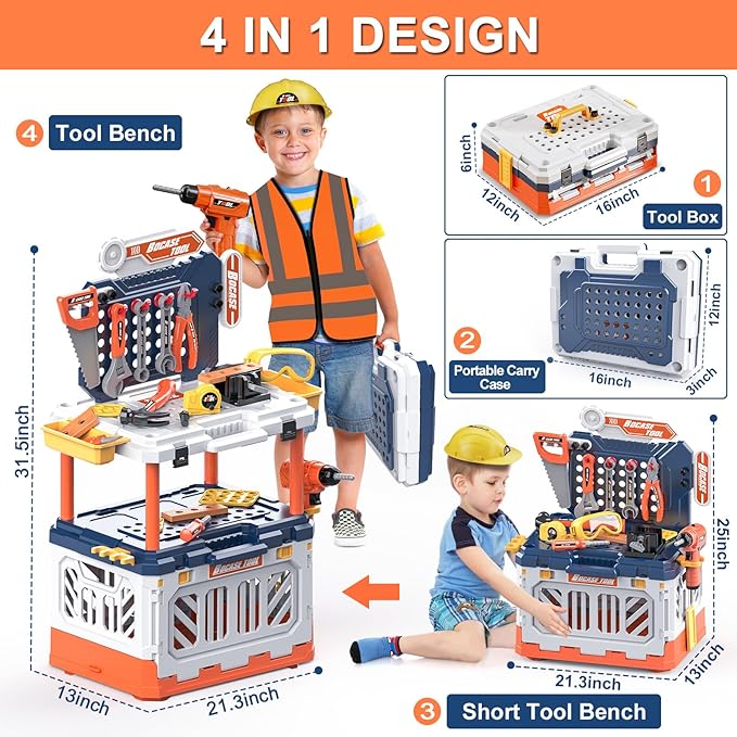 - 【4 IN 1 Design】Kids tool set can turn into a toolbox, portable carry case, stand workbench and short tool bench what you want. Easy to assemble and disassemble, so you can easily carry it whether playing indoors or outdoors.