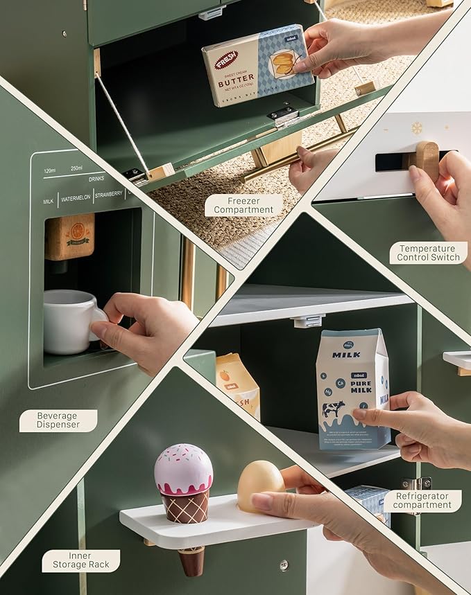 - 🧊 Immersive Playtime Adventure 🧊 Beyond its striking appearance lies a treasure trove of interactive experiences. Swing open those double doors to reveal a refrigerated drawer and engaging accessories that mimic real fridge functions. With quirky details like the wavy slice and pretend juice maker on top, children can unleash their creativity and enjoy hours of imaginative play. It's not just a toy – it's a portal to endless make-believe worlds!