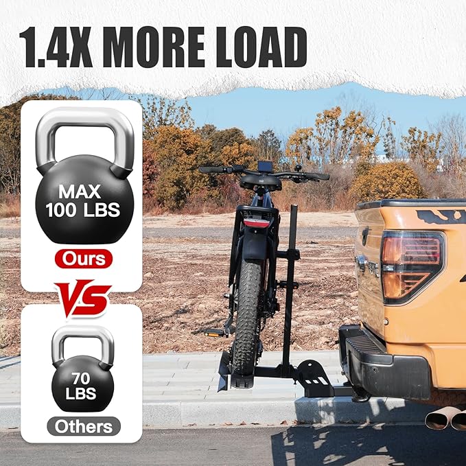 - Heavy Duty & High Compatibility: Supports to carry 1 bike, maximum load capacity is 100lbs. Fits any vehicle with a 2 inches receiver and accommodates bike tire sizes from 2.5 inches to 5.0 inches wide. The adjustable slider effortlessly adapts to wheelbases up to 50 inches, ensuring a secure fit every time. Features anti-loosening bolts with thread sealant, suitable for most standard bikes and heavy-duty electric bikes.