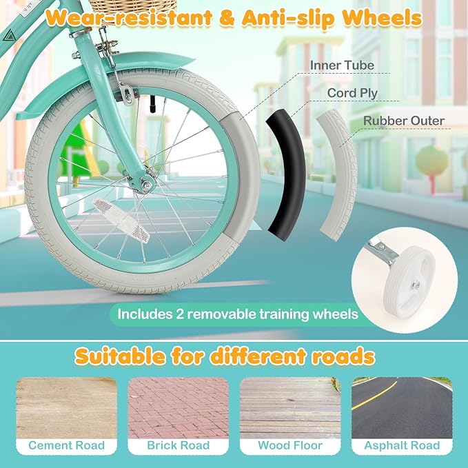 - [ Stable & Safe Design ]: Apart from handbrake which is lighter and easier to maintain, this kids bicycle is also designed with a coaster brake allowing children to stop easily. Moreover, the high-strength carbon steel frame and dual training wheels ensure overall steadiness. While the fully enclosed chain guard avoids hurting little ones.