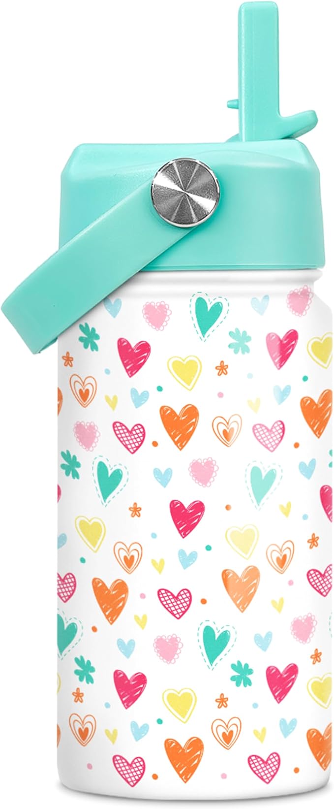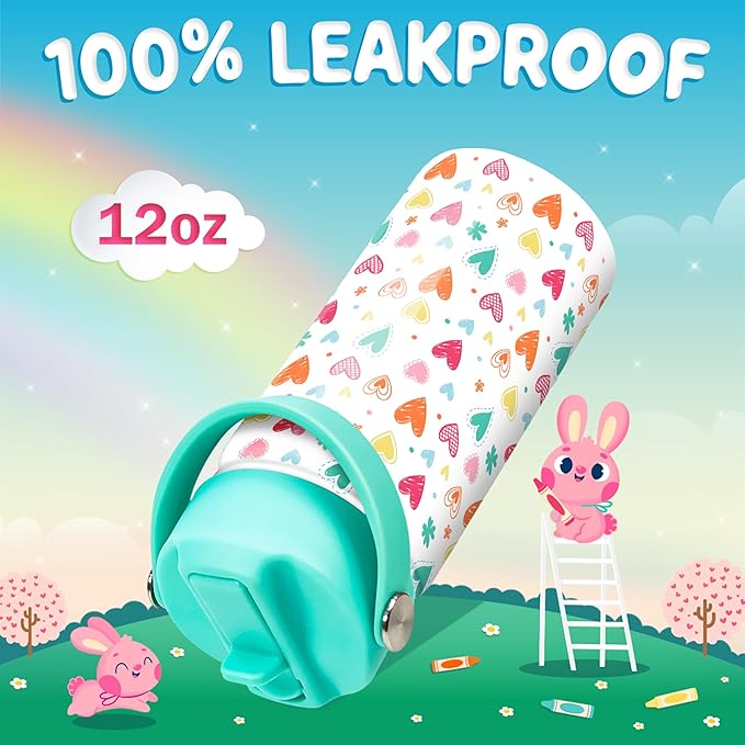 Kids Water Bottle with Straw Lid - Insulated 12 Oz Stainless Steel Water Bottles for Girls - Heart Water Bottle Travel Cup for School Sports