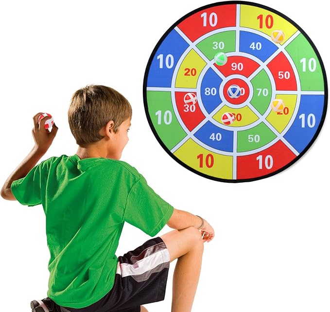 - Package includes: Package comes with 1 piece 29" dart board, 24 pieces sticky balls in 4 colors and 1 piece stick hook, enough quantity for you to play with your friends or families.