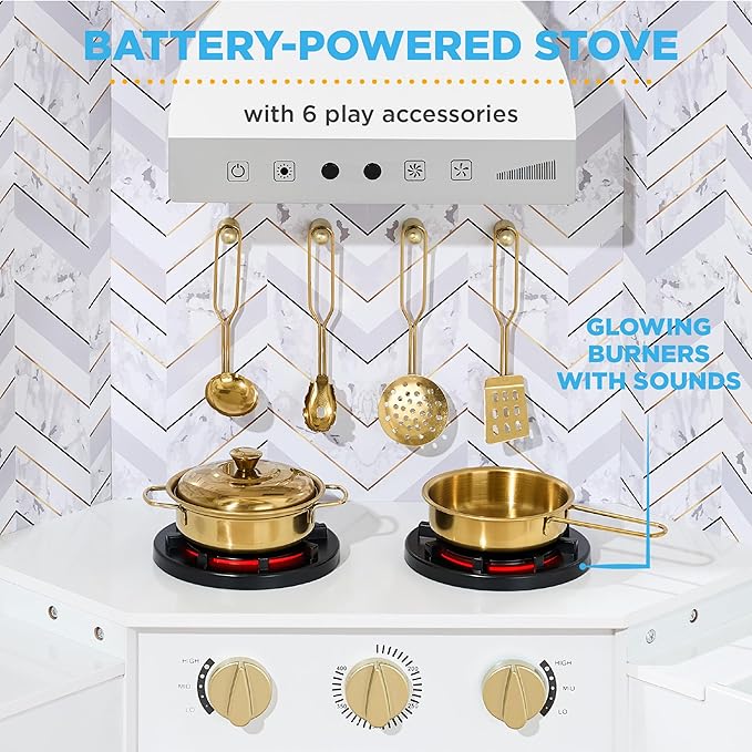 - L-SHAPE DESIGN: A convenient construction allows this playset to fit comfortably in the corner of any room, so your child can engage in hours of kitchen adventures!