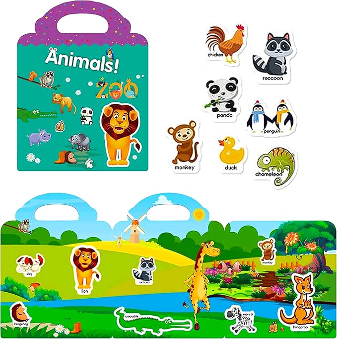 - Reusable Sticker Book for kids: Sticker books were made of waterproof PVC material, no smell and reusable, safe for children. Includes 1 set animal stickers, Your kids can place the removable stickers anywhere in the scene book to create their own story, Also can be pasted on smooth places such as water cup, laptop, book, fish tanks, windows, mirrors etc.