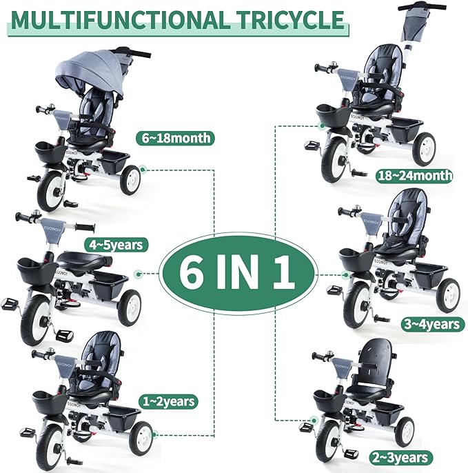 - 6 IN 1 TRICYCLE: With multifunction design, this big kids tricycle & outdoor toys for toddlers can be transformed into 6 modes of use, This baby trike can grow up with a child from 18 months to 5 years which will be a rewarding investment for your child's childhood. Our 6 in 1 kids trikes for toddlers will be one of the good memories of you kids’childhood.