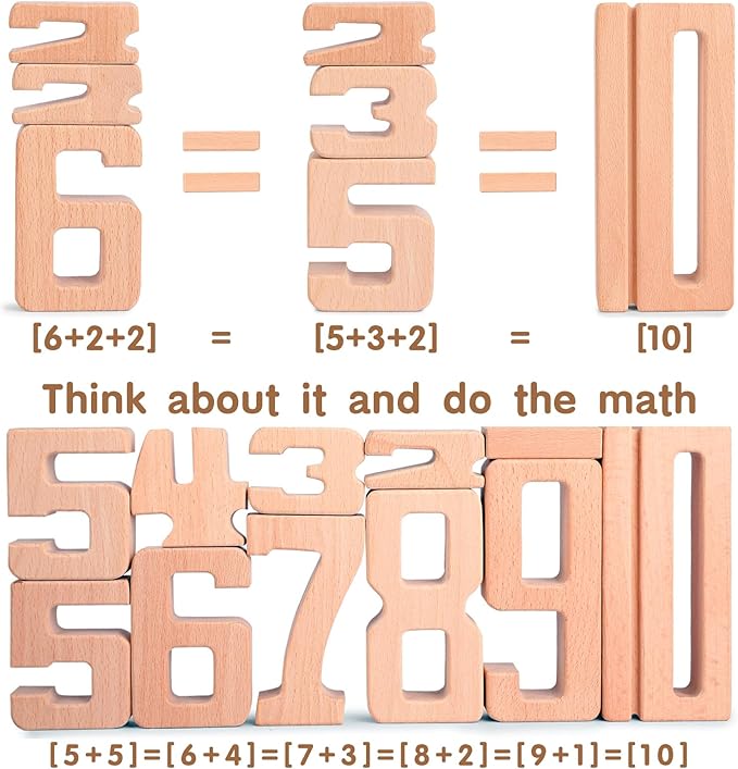 - [SAFETY & ENVIRONMENTAL PROTECTION] : Made of high-quality beech wood. Unlike other wooden numbers building blocks, our counting blocks are unpainted, large, easy to grab, and suitable for children's little hands. The surface of the wooden blocks is smooth and flat without sharp edges and corners, making it durable and not easily deformed