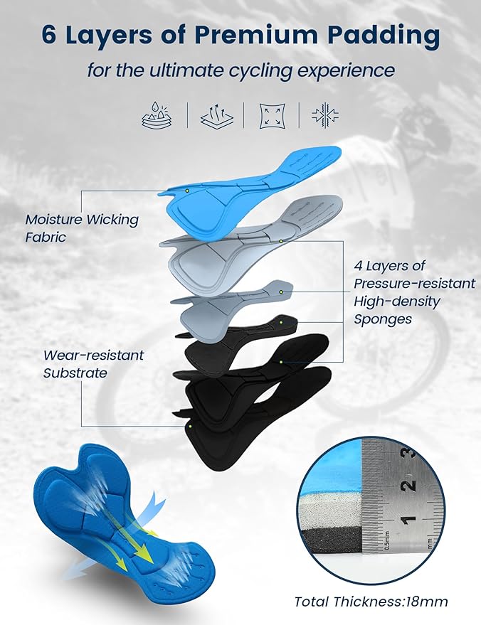 - Ergonomic 4D Padding: The Nepest 4D padding is the result of continuous testing and innovation, ultimately incorporating six layers of sponges with varying densities that work together harmoniously to provide optimal cushioning and support to the cycling shorts. This exclusive structural design is meticulously aligned with male anatomy, focusing on maximizing comfort at high-stress areas and preventing chafing, ensuring you can fully relish every mile of your ride