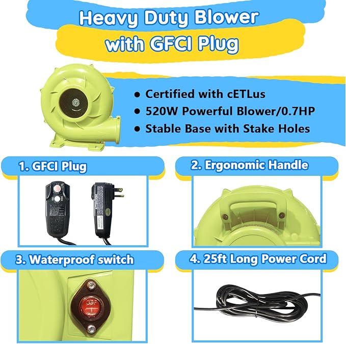 - Satisfaction Guaranteed & Accessories Included - Our goal is to provide complete satisfaction to all customers. In case of manufacturing defects, we offer a 90-day limited warranty on all Causeair bounce houses. A heavy-duty blower with GFCI plug, stakes for the blower and bouncer, repair patches, hose assembly kit, and carrying bag are all included.