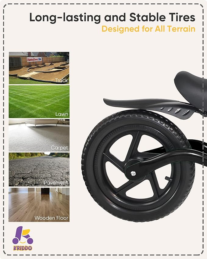 - COMPREHENSIVE UPGRADE - KRIDDO balance bike has undergone a brand-new upgrade, now equipped with premium tires and axle, providing a smoother and more seamless riding experience. The upgraded tires offer enhanced stability, making it suitable for various indoor and outdoor terrains, and are more durable. Whether riding indoors or on rough outdoor surfaces, KRIDDO balance bike ensures a stable and comfortable riding experience for children.