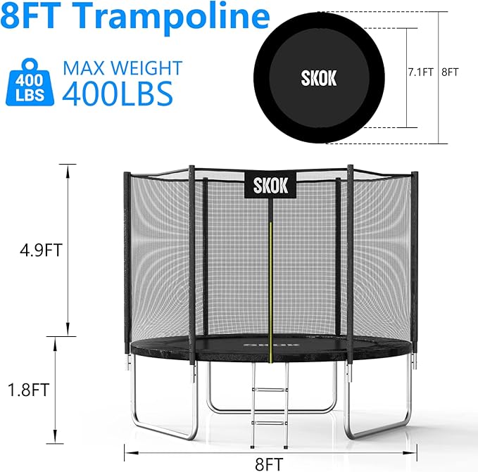 - 【Design for Safety】SKOK 8ft black kids trampoline is comply with officially ASTM 381/ASTM F2225-15 Standard Safety Specification , CPC, ISO, and BSCI approved. Our 8 ft trampoline has been tested for 10,000 jumps. Mats are tested up to 3,000 hrs and can hold up to 400lbs. Kids can jump and exercise safely and happily!