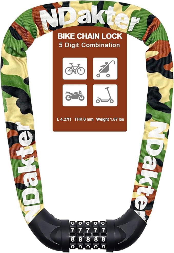 NDakter Bike Chain Lock, 5 Digit Combination Heavy Duty Anti Theft Bicycle Chain Lock,2.62/3.2/4.27/5/6Ft Long Security Resettable Bike Locks for Bike, Bicycle, Scooter, Door, Gate, Fence-4/6mm Thick