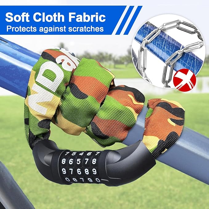 - SCRATCH-PROOF FABRIC PROTECTION: The bicycle chain lock is wrapped by a high quality polypropylene fabric, which is scratch-proof and wear-resistant, anti-hot and anti-icing hands; it protects the chain and prevents it scratching your bicycle frame, long lifespan.