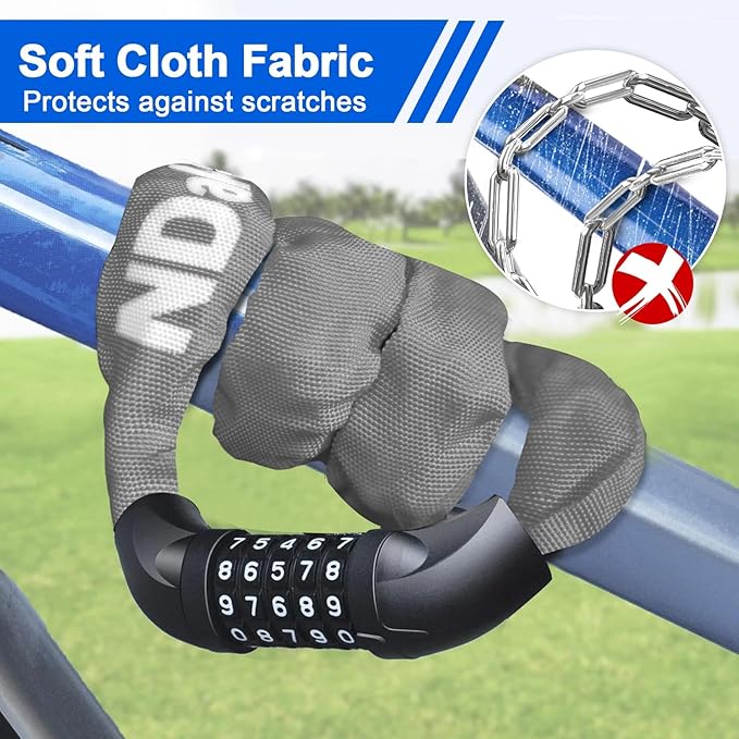 - SCRATCH-PROOF FABRIC PROTECTION: The bicycle chain lock is wrapped by a high quality polypropylene fabric, which is scratch-proof and wear-resistant, anti-hot and anti-icing hands; it protects the chain and prevents it scratching your bicycle frame, long lifespan.