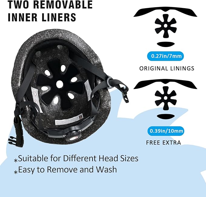 - 11 airflow vents, keep your kids cool and comfortable. 2 sets of removable and washable interior padding with different thickness (7mm, 10mm) for personalized fit.