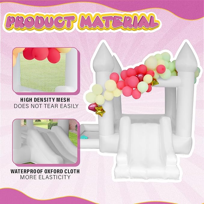 - 【Funny and Safe】Our castle has slides and extra bobo balls for you, add fun to your play. The bounce zone is soft for young kids and safety with the protective net. Our white bouncy house comes with a powerful blower that inflates it in just 1-2 minute.