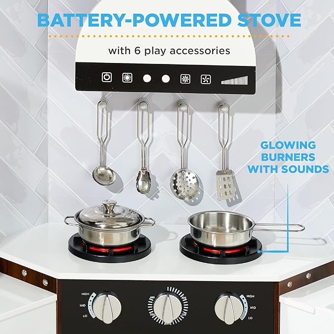 - TRUE-TO-LIFE KITCHEN: This includes a built-in play microwave and oven with clicking knobs, a light-up hood that mimics authentic sounds, and a battery-powered ice dispenser and stove for an immersive, interactive experience