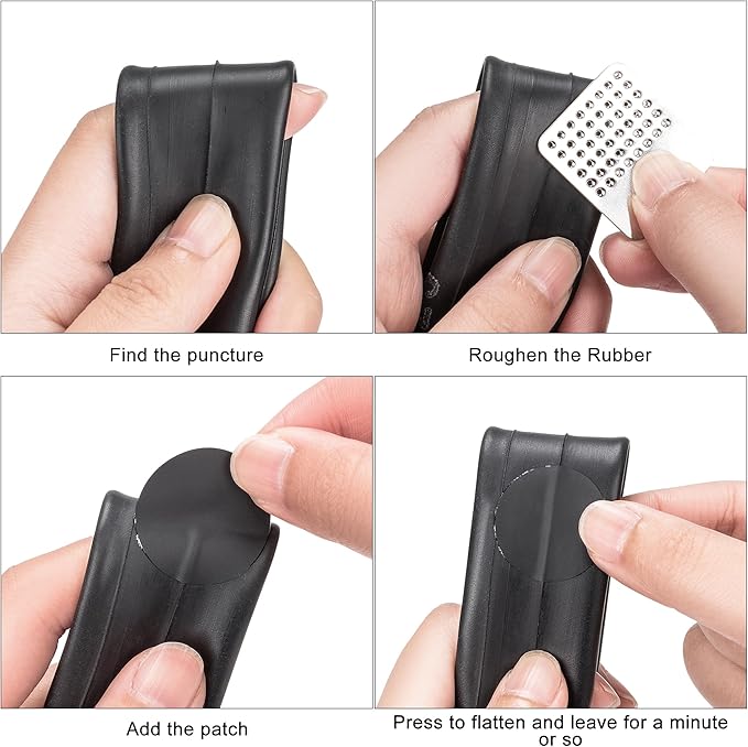 - 【BIKE TIRE REPAIR】— Use your tire levers, Take the tire out of the bead, Locate where the air is escaping from. Use metal rasp tool to rough up the area around the puncture so that your adhesives have something to grip. Then press glueless punch firmly over the hole and insert tube into the tire and re-inflate.