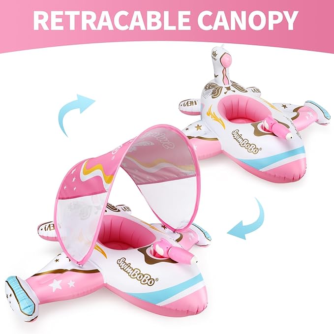 - 【Attractive shape】Cool Airplane boat pool float will introduce your baby to the joys of water, Suitable for children 3+ years old,Removable/adjustable canopy features a multi-position plastic hinge, which allows for 120-degree range and UPF 50 sun protection.