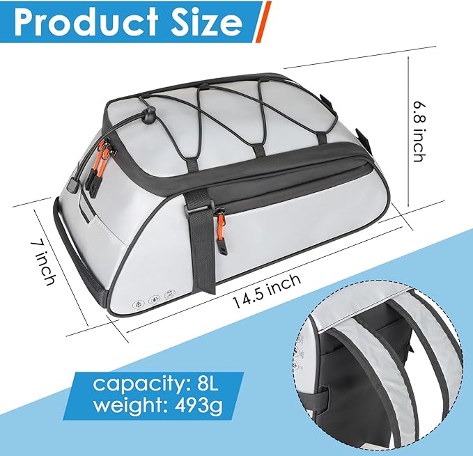 - All-round Reflective Bike Rear Rack Bag --- This whole bike rack bag is designed with reflective fabrics except the zippers areas. Also the rear loop of this bike trunk bag for taillight also has reflective strip too, which increase visibility at night, making your night riding more safe.