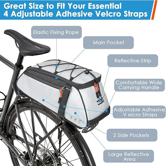 - Easy To Install and Release --- This bicycle saddle bag is designed with 4 adjustable attachment strips, which makes it easy and fast to install on many kinds of bike rear seat. Rear bike rack bags for bicycles can effectively hold it securely in place to your rack when passing through bumpy roads and easy to take it down. Great bike accessories for adults, suitable for mountain bikes, road bikes, electric bikes. etc.