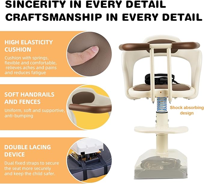 - 【COMFORTABLE AND ELASTIC SEATS】The baby bike seat adopts a high elastic leather cushion and backrest, and the sponge wrapped handle makes the seat more soft and comfortable; The bottom support steel pipe is equipped with a high elastic shock absorber spring, which makes children ride more smoothly and reduces fatigue;