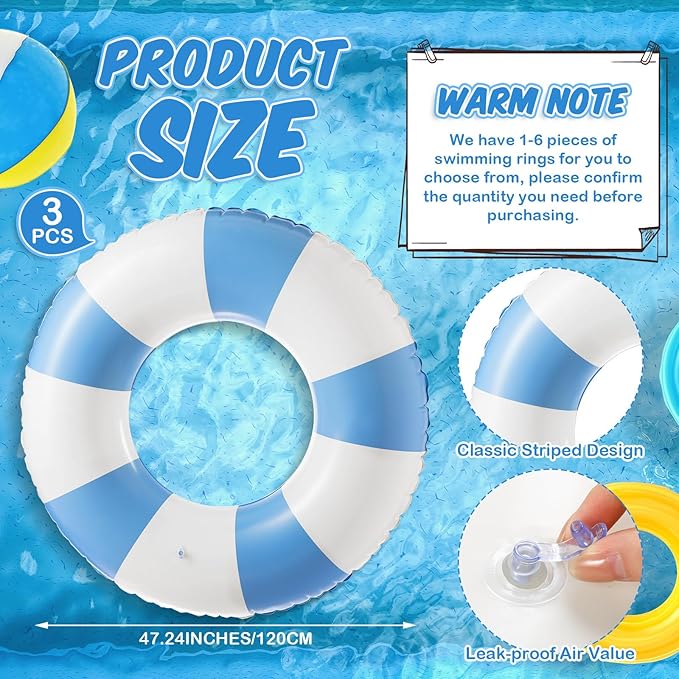 - Jumbo Striped Swimming Ring: you will receive 3 inflatable swimming ring; The classic blue and white stripe is nice for creating a cheerful summer atmosphere in the sun and water, making you stand out in the crowd, can also help your kids and partners easily find you in the water; Warm reminder: please note that when using, avoid placing our swim rings in pools that have been cleaned with pool cleaning agents, as chlorine bleach powder can cause the rings to change color
