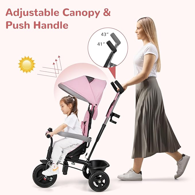 - Adjustable Heights & Angles: The detachable push handle of the baby stroller can be adjusted to 2 different heights (41”,43”) for parent’s needs. In addition, the seat of the tricycle can be adjusted forwards, backwards and switched to a rear-facing positions, which is perfect for interaction and communication. The retractable footrest allows baby to have a right place for feet in stroller mode