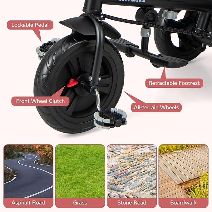 - 6 in 1 Convertible Tricycle: This INFANS baby tricycle is designed to adapt to child’s growth, offering 6 modes to use: push stroller, rear-facing stroller, steering tricycle, learn-to-ride trike to accommodate changing needs and ensure maximum utility. The foot switch of the front wheel can be turned on when learning to ride trike. It is suitable for kids aged 9 months-5 years