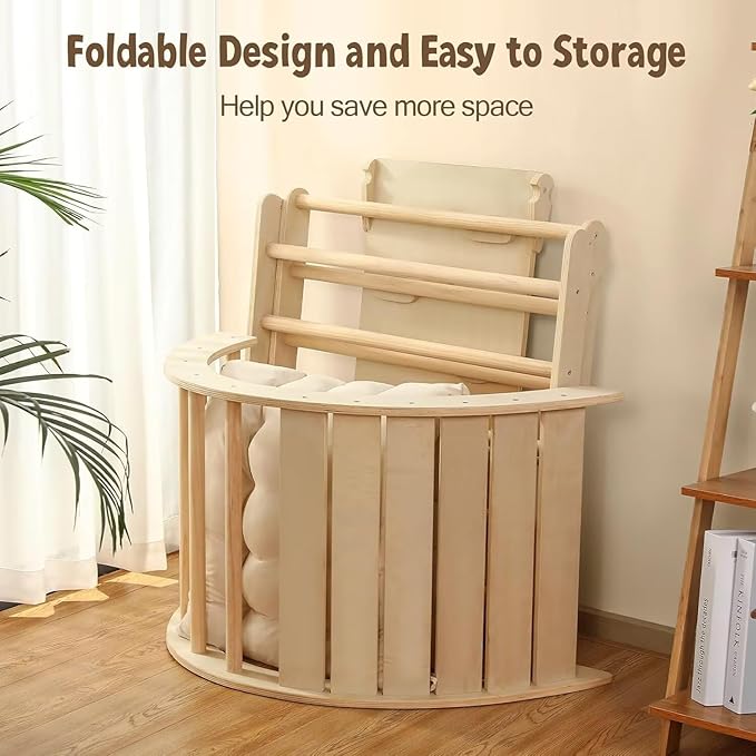 Pikler Triangle Set with Cushion Large, 5 in 1 Toddler Climbing Toys Indoor, Montessori Foldable Climbing Set for Kids, Wooden Playground Jungle Gym with Ramp, Arch and Ladder (Wooden Color)
