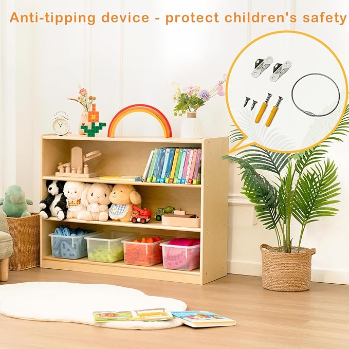 Kids Bookshelf and Toy Storage Shelf, Wooden Montessori Bookshelf, 3-Tier Toy Shelf, 30in Birch Children Bookcase, Classroom Furniture, Book Shelf for Kids Room, Nursery, Playroom