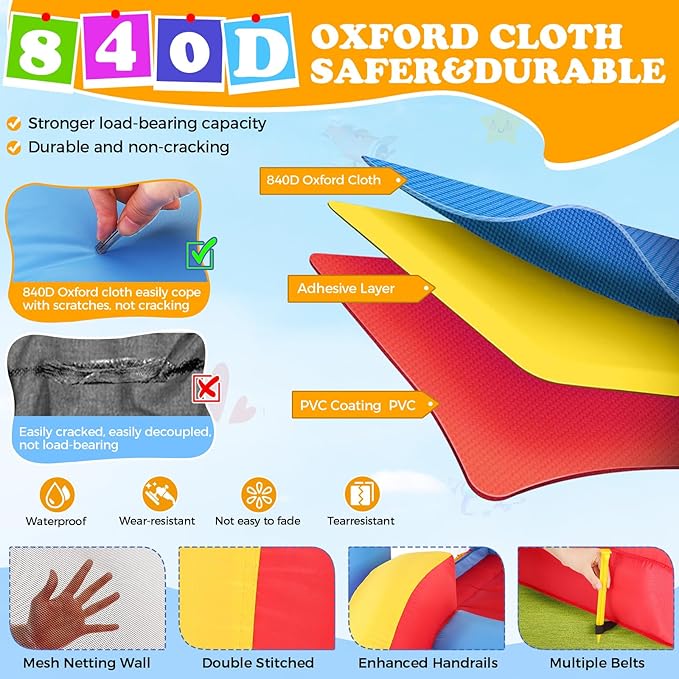- 【MUCH DURABLE THAN OTHERS】Whubefy bounce house is perfect for kids aged 3-6 and big kids, offering premium safety design for your peace of mind. Made from heavy-duty 0.4mm vinyl and 420D + 840D puncture-resistant material that withstands intense jumping, rolling, and active play. Reinforced stitching provides maximum strength for years of joyful bouncing. It features mesh safety netting to prevent falls, and raised handrails on both sides of the slide with cushioning at the bottom to prevent kids from sliding out. Plus, a storage net prevents loss of shoes, hats, and other items